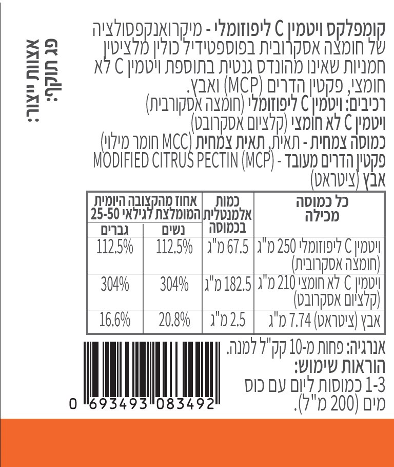 מנה של 2 כמוסות מכילה 920 מ"ג ויטמין C (500 מ"ג ויטמין C ליפוזומלי , 420 מ"ג ויטמין C לא חומצי) וכן 15 מ"ג אבץ ציטראט + פקטין הדרים (MCP)